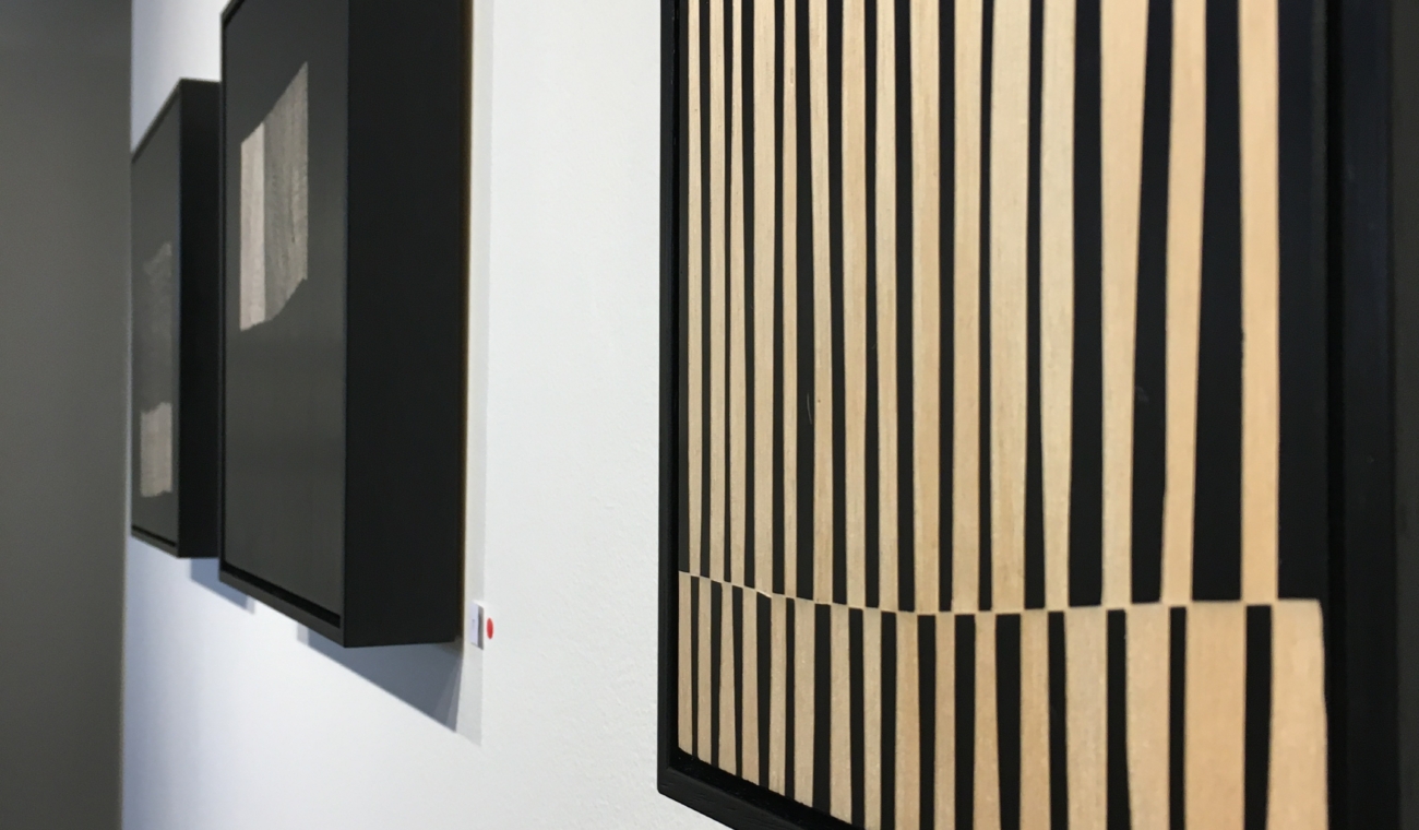 In a technique which is close to sgrafitto, the artist has meticulously carved black-painted woodblocks with fine-gauge chisels, revealing the wood below the paint layer. In this body of work, Rayson achieves several beguiling optical affects in her austere compositions, through variable depth and placement of the carved lines and hatches.