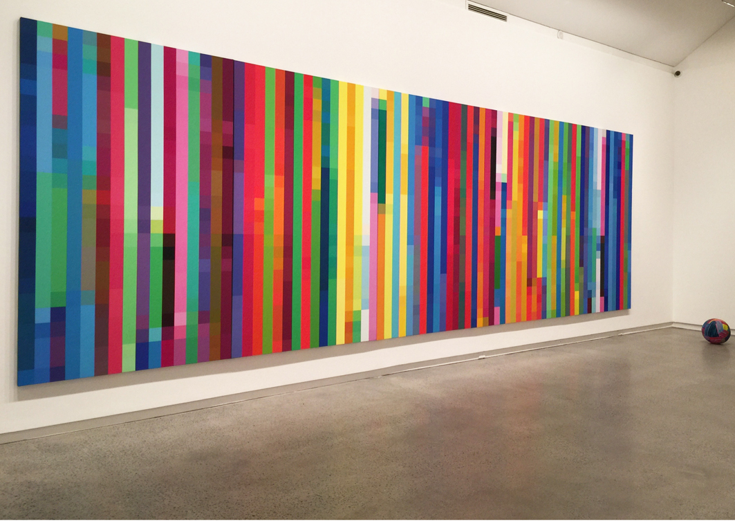 Stately at one moment, entertainingly optical at others, Owen’s paintings explore persistent genres of abstraction, from the monochrome to jazzy geometrics, but always at the strategic service of deeper ideas concerning intuition, emotion, atmosphere, time’s passing – all variously and vitally present ‘states’ in our relation to the world, but often notoriously difficult to nail down. Hence it might seem that the artist’s intention often seems quixotic, as the he loads meaning and often mathematics into acres of smart and elegant images. But in his example, again and again, he makes the demand that we also ponder these themes – that in projecting ourselves into his images we might for moment reconsider our own sense of self in relation to matters of life, time, cosmos…encouraging each of us to become a centre rather than a cypher.