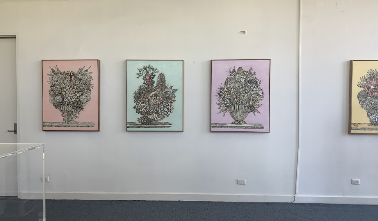 A meeting of works by Amelda Read Forsythe and Alicia King reveals one of those moments of aesthetic relation. Read Forsythe’s participation extends to five paintings, themselves referring to Pieter Casteels III early 18th century series itself titled Twelve Months of Flowers. The oil on board artworks reveal a dramatic change in direction for the artist in terms of palette. Hints of lolly bright pastels highlights in her predominantly monochromatic, or subdued greens and browns of perennial autumn, are now in full display. They are bright and brilliant, incongruous even, a display of native flora, of exotic mysterious flora, presented for official observation of formal still life. Her deft application techniques are lost in digital, flattened. You must be physically present to perceive the illusory qualities via juxtapositions of brushwork, creating a depth to the image rendering it both solidly an object and a feather-light image. The zoomorphism qualities in those petals, blooms and stems like feathers, bristles, spikes, call gently to the frazil-like works of Alicia King, whose interrogation of biotechnology in her metal, organic and synthetic amalgam sculptures and wall objects seem a world away from Read Forsythe in their colour and media, bar these feathery spikes reaching out to each other like magnets. The nexus of that conversation: mother nature and contemporary culture, they could (and should?) be in a room by themselves getting down to some serious existential discourse.